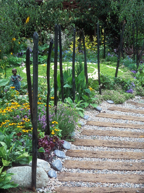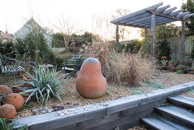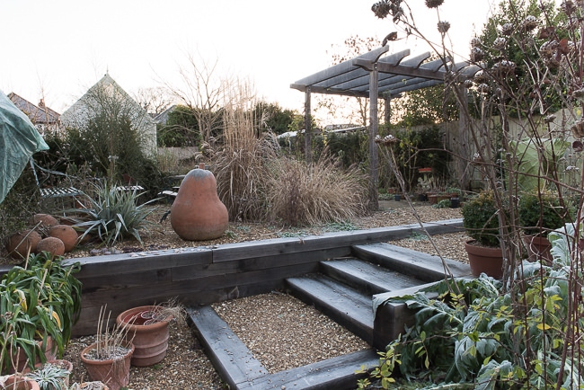 Steps made out of oak sleepers lead up to a different level in a gravel garden