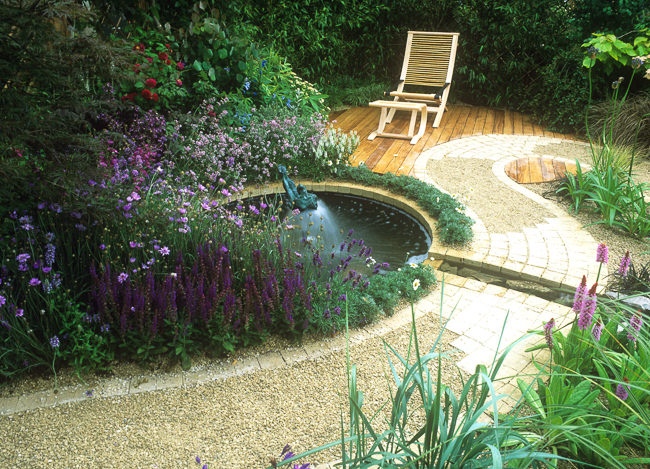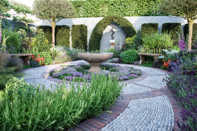 Circular water bowl surrounded by a carpet of Thyme in a modern herb garden